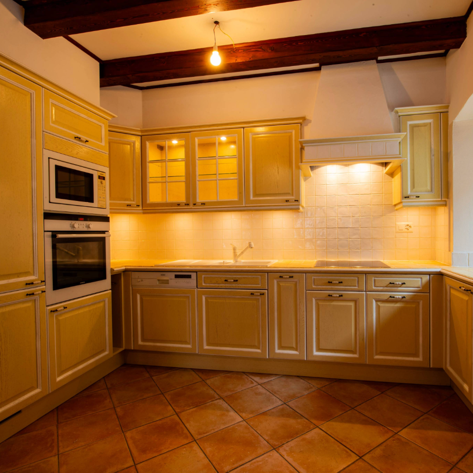 - une cuisine de style provençal, entièrement équipée avec vitrocéram et micro-ondes, ouverte sur une accueillante salle à manger,